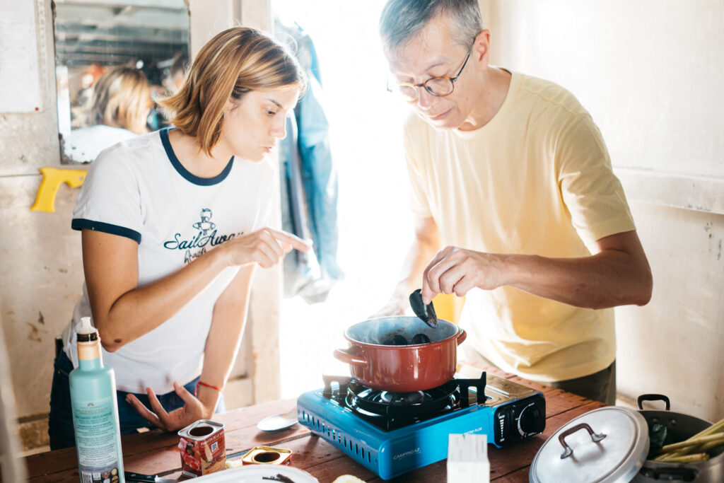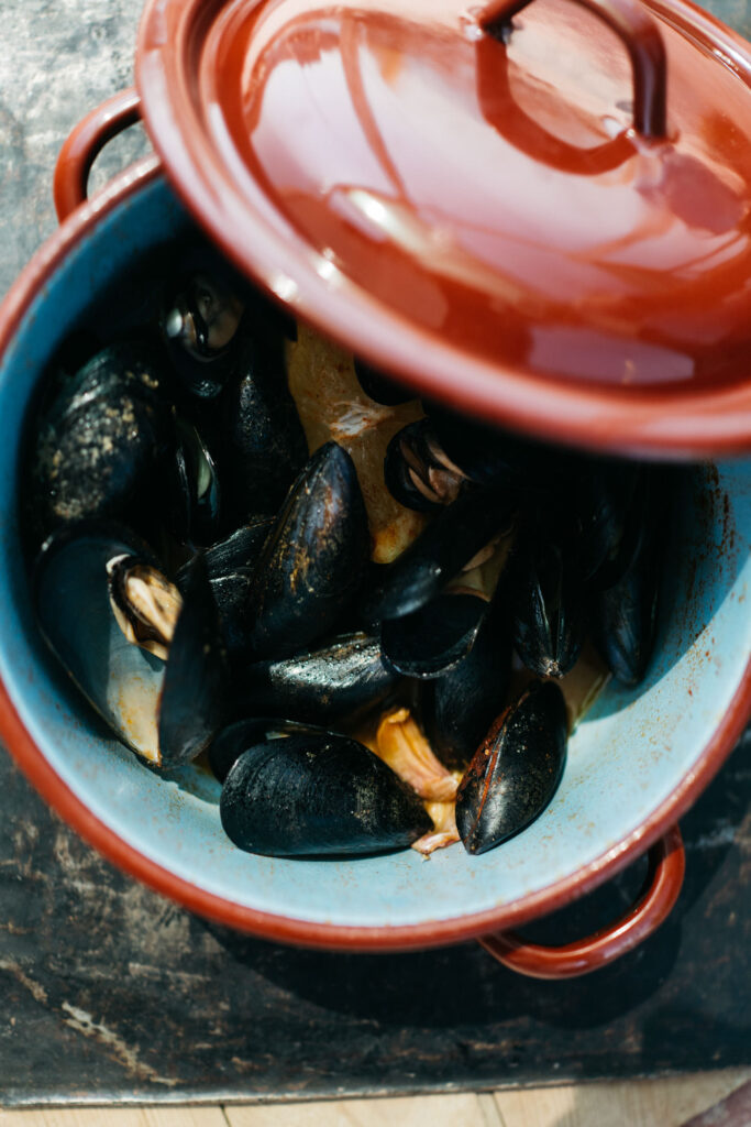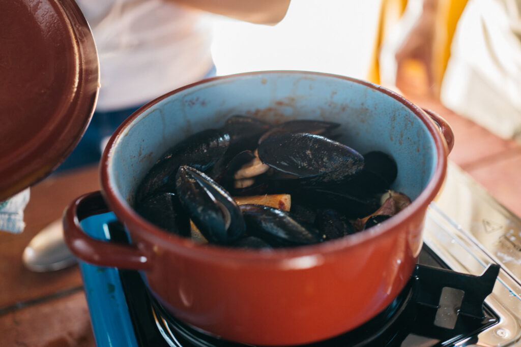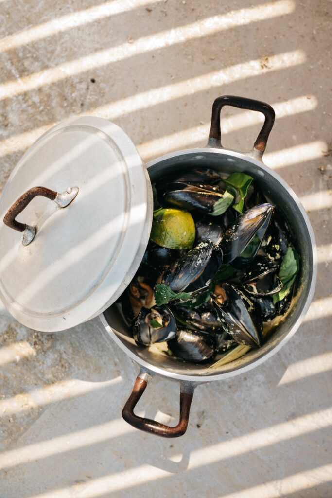 Calienta una olla con un chorro de aceite y echa las clòtxinas con trozos de limón, una hoja de laurel y una pizca de pimentón. Tapa enseguida la olla y después de unos minutos, agita bruscamente la olla para despúes destaparlo y llenar el puente de mando de la batea con un olor que solo se puede describir como la esencia del mediterráneo. Pero en la batea de Les Perles, no hay clòtxinas sin ostras, y Leyre se ocupa de abrir una docena de ostras con una facilidad abrumadora para que podamos disfrutar y contrastar estos dos moluscos hermandados en el puerto de Valencia.