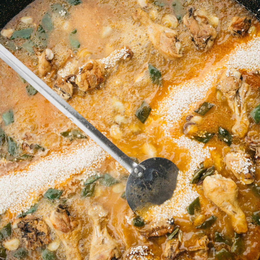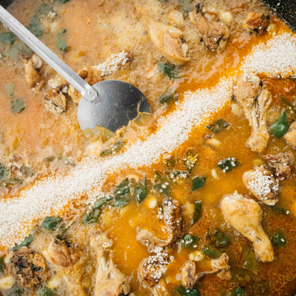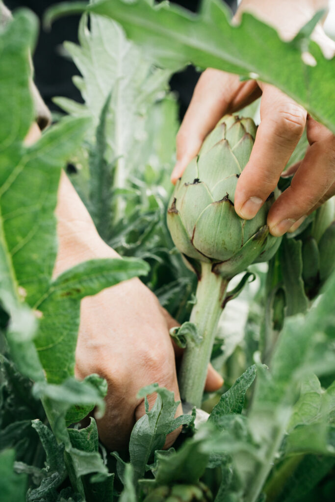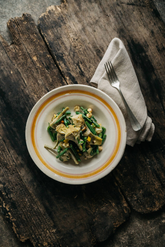 La historia de Toñi y su compromiso con el campo debían quedar reflejados en los platos de Ma Khin. Por ello, nuestra ensalada de alcachofas, inspirada en una receta del chef internacional Yotam Ottolenghi, funde la tradición valenciana con la visión innovadora de este famoso cocinero. Combina judía bobby y alcachofas con avellanas, que se aliñan con AOVE de Viver, y un encurtido casero de limas – lime pickle, logrando el toque cítrico y especiado que tanto nos gusta en casa. Un homenaje a tantas horas de esfuerzo.