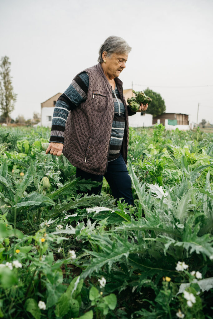 Toñi Mocholí Bayona vivió una época en la que el trabajo del campo definía el ritmo de vida de muchas familias valencianas. Nacida en 1949, en el barrio de la Torreta, creció rodeada de campos y surcos, ayudando desde niña a trabajar la huerta, para luego vender sus productos en los mercados. Recuerda con especial cariño los carros tirados por caballos, las ruedas de hierro en dirección al Mercado de Abastos y ese salto brusco al final del trayecto, que siempre la despertaba justo a tiempo para descargar. Podría decirse que ha dedicado su vida al cultivo de hortalizas: alcachofas, acelgas, rábanos y rabanitos. Un oficio que durante años desempeñó junto a su marido, Manuel Tomás.