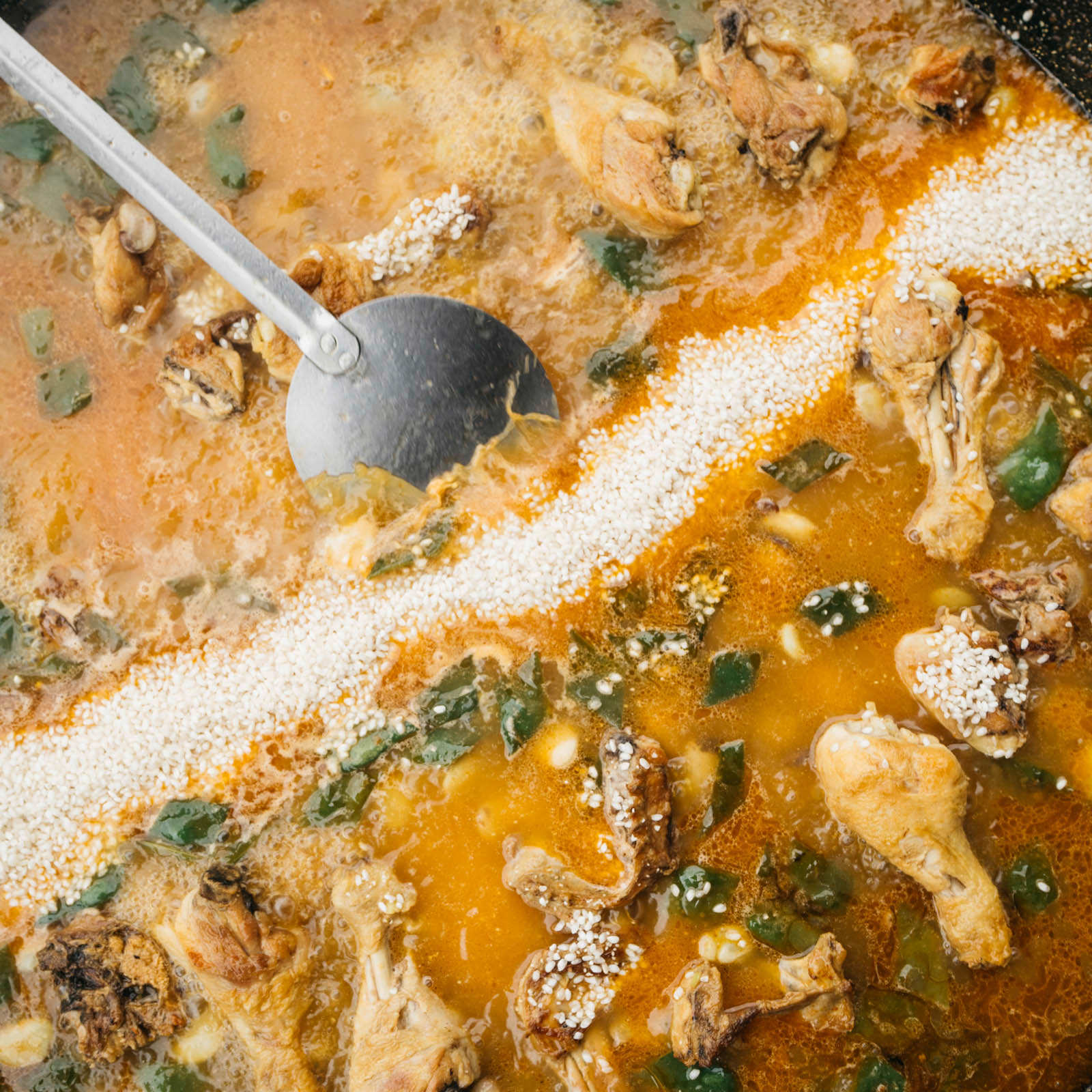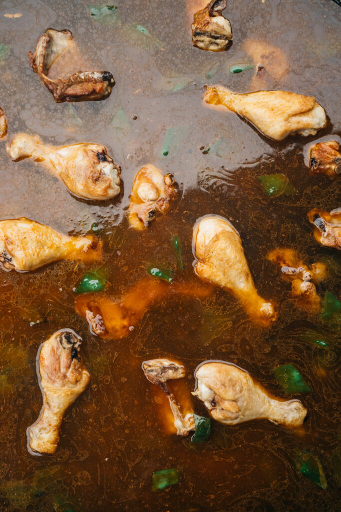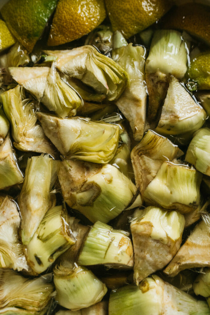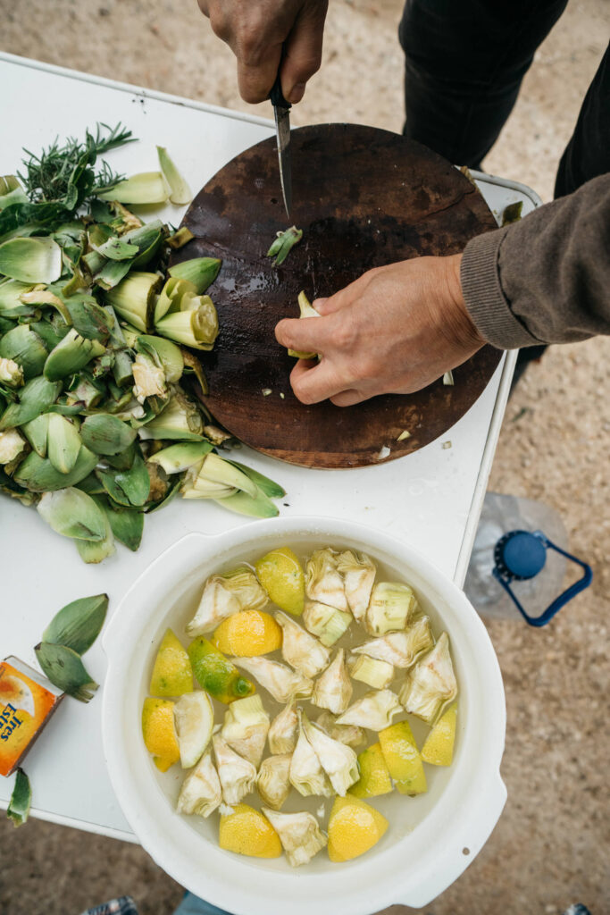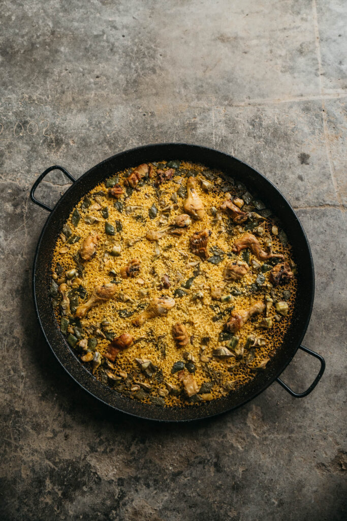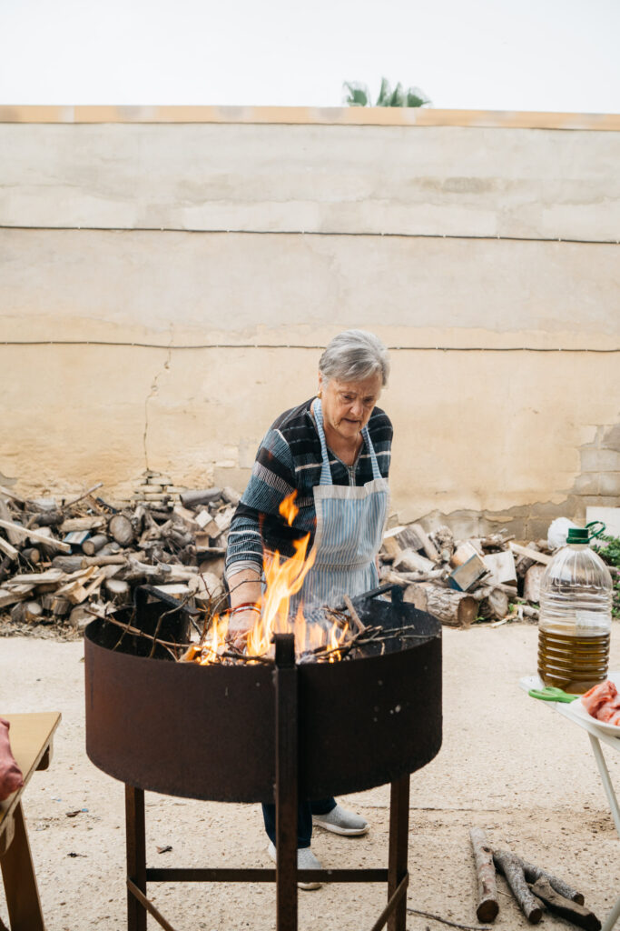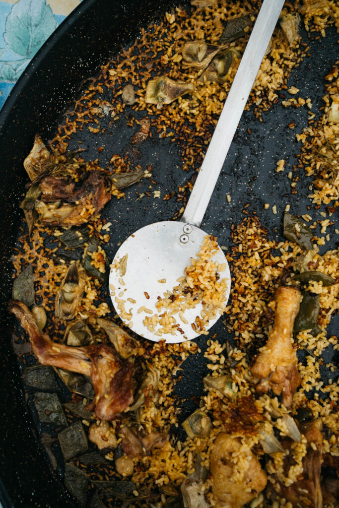 En su casa de La Font d’en Corts, Toñi comparte con nosotros la experiencia de tantos años, y nos enseña a preparar su receta de paella de alcachofas sobre leña, que con el tiempo ha ido perfeccionando. Para esto, utiliza algunas verduras de su vecino Aurelio, cuyo puesto Frutas y Verduras Fina en el Mercado Colón es de una calidad legendaria entre los vecinos del Ensanche. Con destreza, corta y limpia las alcachofas, que deja reposar en agua con limón para equilibrar el amargor. “El truco para que el arroz no se vuelva negro está en el orden”, nos dice mientras sofríe la carne hasta dorarla, añadiendo después batxoqueta, tomate y pimentón. Una vez que el arroz está hirviendo, agrega el azafrán, y por último, reparte las alcachofas por encima, dejando que se cocinen al vapor. El resultado es un socarrat perfecto y un sabor delicioso, donde influye mucho la verdura.